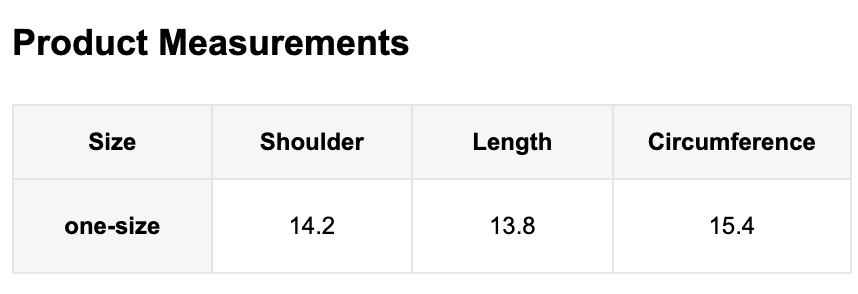 Measurements: 13.8in (Length) 14.2in (Shoulder) 15.5in (Circumference)